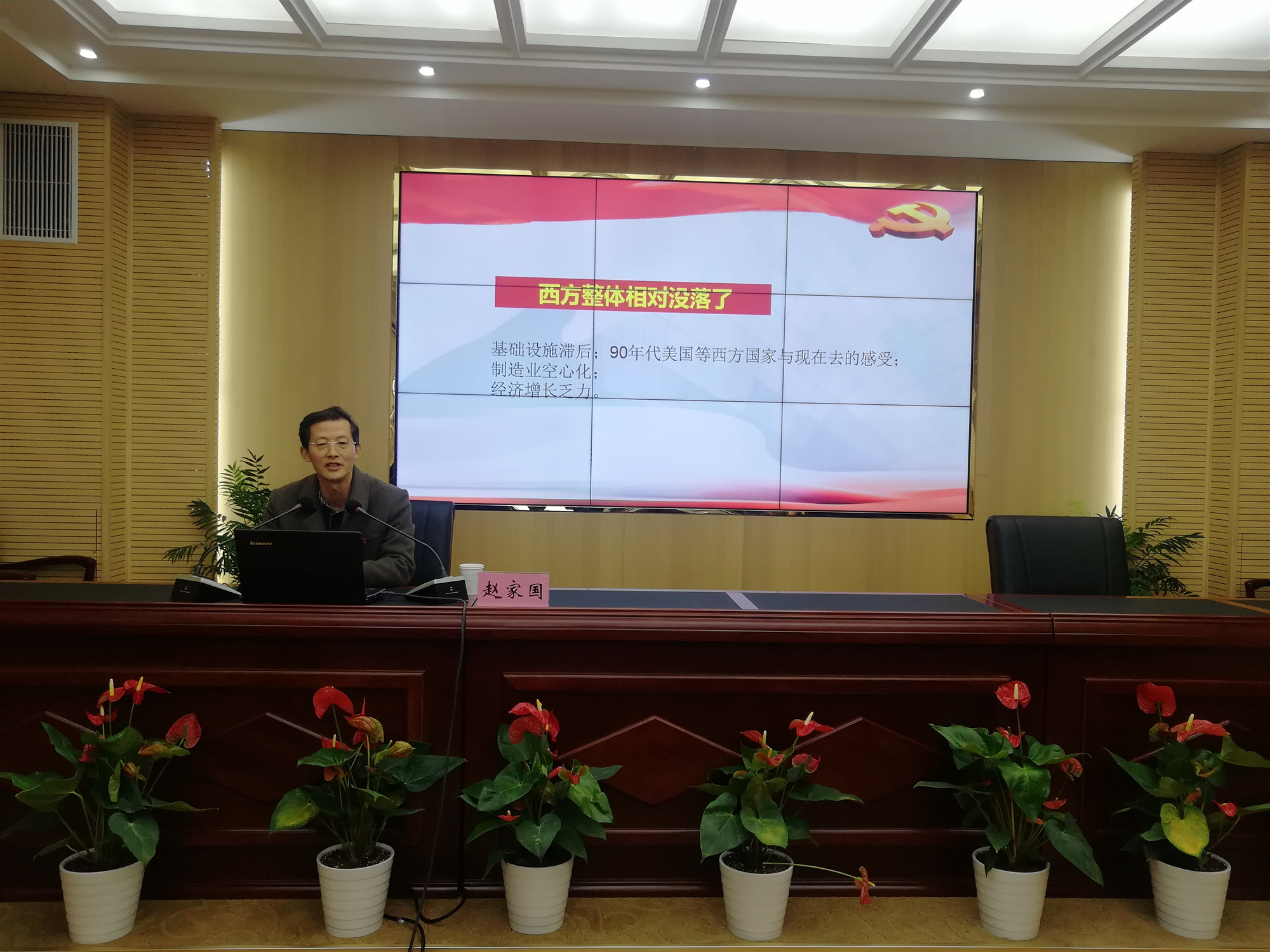 接著,趙家國教授以“12345”為提綱挈領,結(jié)合國內(nèi)國外形勢,為大家詳細解讀了黨的十九屆五中全會精神的精髓和要義?!?”是一個重大判斷揭示未來發(fā)展環(huán)境異常復雜:《建議》提出當前和今后一個時期,我國發(fā)展仍然處于重要戰(zhàn)略機遇期,但機遇和挑戰(zhàn)都有新的發(fā)展變化?!?”是兩個全局了然于胸謀劃未來:《 建議》指出全黨要統(tǒng)籌中華民族偉大復興戰(zhàn)略全局和世界百年未有之大變局,深刻認識我國社會主要矛盾變化帶來的新特征新要求....。我們從這兩個大局出發(fā)來制定規(guī)劃。“3”是三個“新”揭示新征程無比豪邁:新階段、新發(fā)展理念、新發(fā)展格局?!?”是四個首次展現(xiàn)復興圖強雄心壯志:堅持創(chuàng)新在我國現(xiàn)代化建設全局中的核心地位,首次把全體人民共同富裕取得更為明顯的實質(zhì)進展作為遠景目標提出,首次明確了建成文化強國的具體時間表,明確提出到2035年建成文化大國,首次提出確保二〇二七年實現(xiàn)建軍百年奮斗目標?!?”是五大原則體現(xiàn)黨的領導更加成熟高超:堅持黨的全面領導,堅持以人民為中心,堅持新發(fā)展理念,堅持深化改革開放,堅持系統(tǒng)觀念。